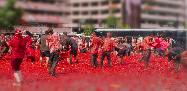 La Tomatina festival in Spain is held at the end of August in the Valencian town of Bunol. Participants of the festival come together to throw tomatoes and get into a huge tomato fight simply for entertainment.