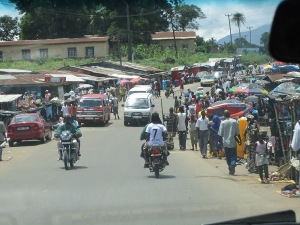After about an hour in the second poda-poda, we arrived painlessly to the Waterloo office, where we met with area managers and credit officers to review a few upcoming Kiva-BRAC related projects. We enjoyed a nice meeting and locally prepared lunch, but after a few hours my mind began to wonder how we were going to get home. I didn’t see too many vehicles going in the opposite direction, so perhaps we were in for a treat that afternoon. As we wrapped up our meeting, Mbalu and I walked to the main road in Waterloo, where the scorching sun showed no mercy. After a few minutes of watching packed poda-podas speed by, we successfully waved down a poda-poda with two open spots, but Mbalu turned to me and said, “This will only take us part of the way. There is bad traffic in town, so we will have to find another driver once we get there.” By then, I was convinced we would be able to find another shared car, but once we arrived into town, my hopes deflated.