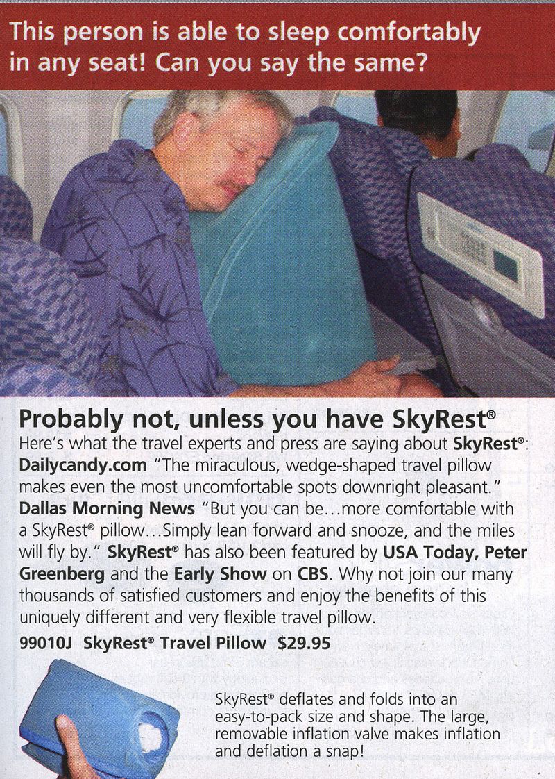 The silence lasted about 15 minutes, until our plane began its ascent and the same man to my left pulled out a SkyMall purchased green blow-up tray table pillow. Admit it — you know what I’m talking about! It’s that outrageously oversized item in SkyMall Magazine that, when you’re flipping through the pages, catches your eye and forces you to pause for a few seconds and contemplate: “Seriously, who on earth would ever need or want this.” (Photo below if you’re not familiar.)