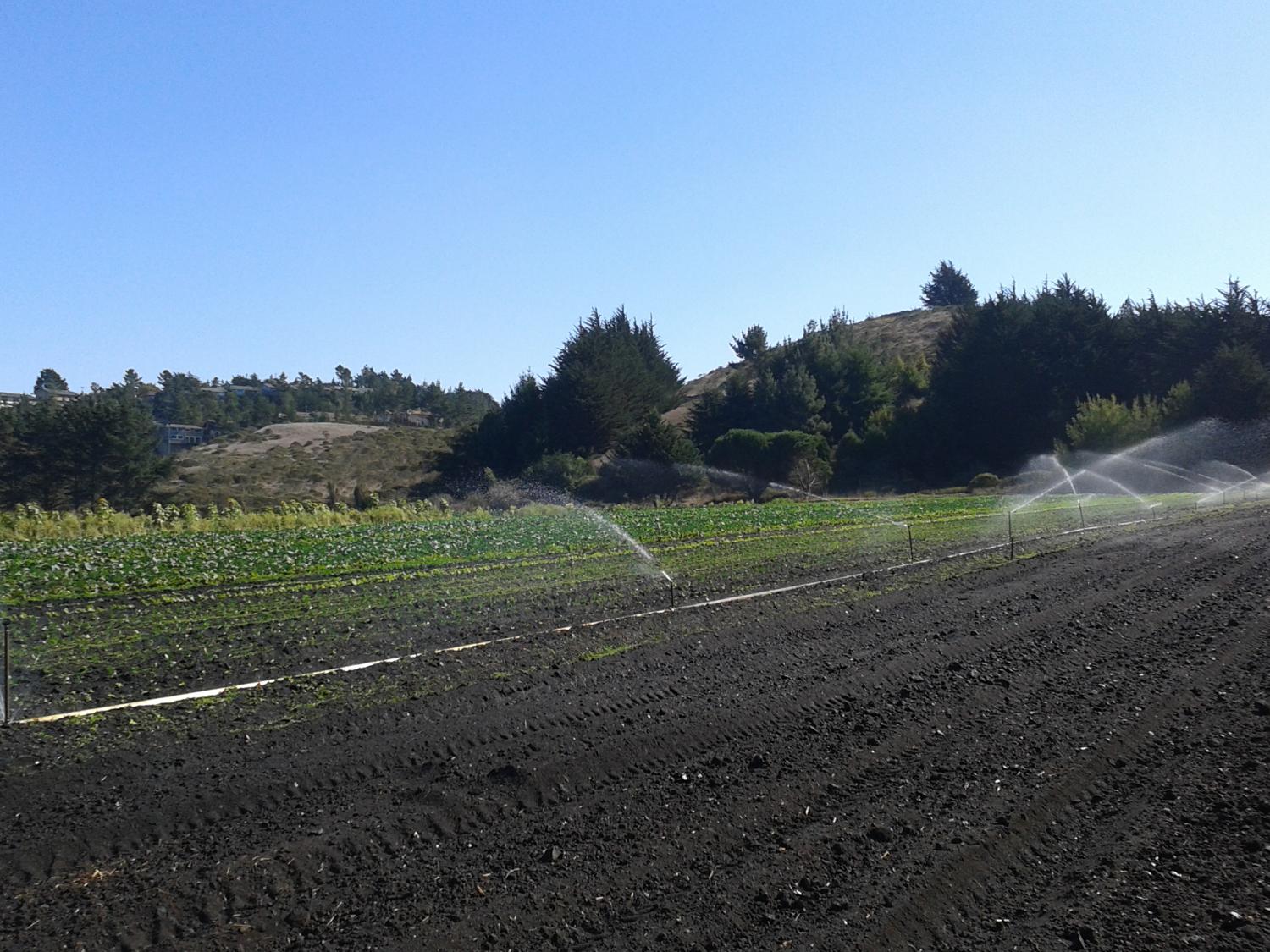 Once through the checkpoint, we took a wide berth of the ugly concrete behemoth that is the San Francisco County Prison’s San Bruno Complex. A dirt road leads off to the side, flanked momentarily by some tall trees. You come out into open fields of freshly turned earth and long rows of growing vegetables being drenched by sprinkler under the midday sun.
