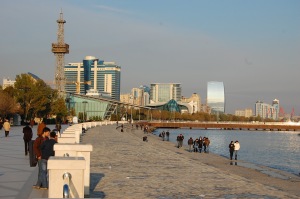 The Bulvar, Baku’s seafront promenade, built on pilings sunk into the bed of the Caspian Sea. A good two-thirds of the buildings in this picture have gone up within the last ten years.
