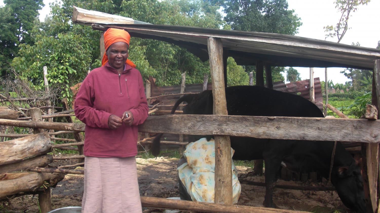 Although she initially thought about buying dairy goats with her Kiva loan, she eventually decided to increase her existing cow productivity and her kids’ sanitation with it. She built a safer area around the cow with an aluminum roof and cement ground, to reduce the cow’s movements when being milked thus the waste. As a mother of four children and two grandchildren living around, she used the remaining cement and money for her family pit latrine.