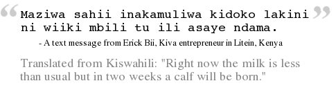 There are a couple of exciting aspects to this method of getting journal updates. First, there’s no need for an intermediary: the text message responses are received and compiled automatically at Juhudi’s main office, and sent to Kiva’s website as soon as they’re reviewed. We want our lenders to read the exact words of the entrepreneur, so for now, journals received in Kiswahili will be posted as is—we’ll show the English translation of the questions ask, but rely upon our lenders to provide a translation of the responses (perhaps from Kiswahili speaking acquaintances or lenders, or failing that, a web service like Google Translate).