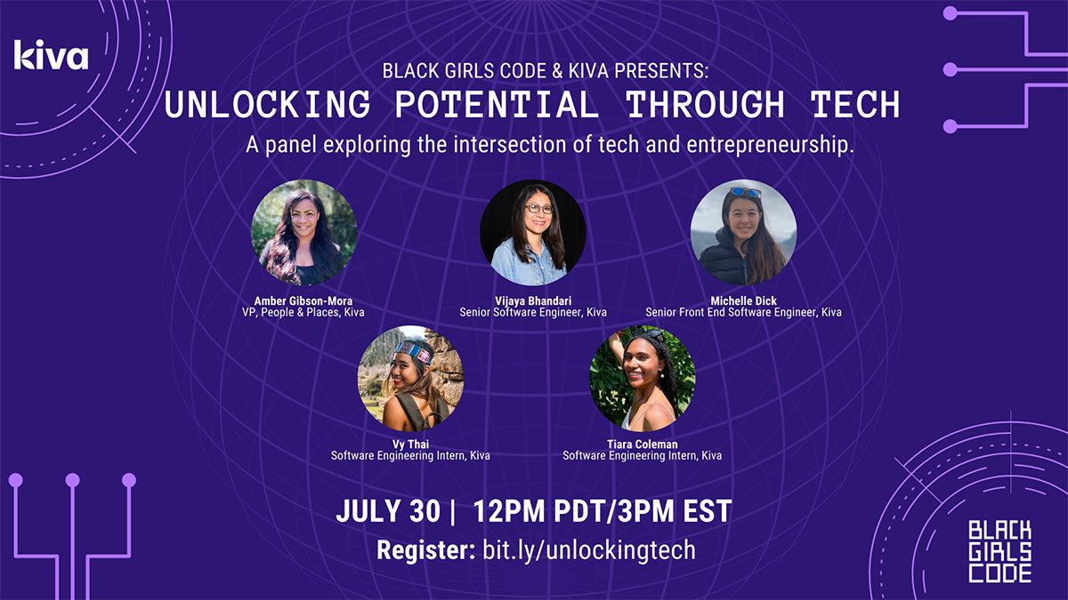 This event will explore the intersection of tech and entrepreneurship with Black Girls Code organizers and Kiva changemakers, including Amber Gibson-Mora (VP of People and Places), Vijaya Bhandari (Senior Software Engineer), Michelle Dick (Senior Front End Software Engineer), Vy Thai (Software Engineering Intern), and Tiara Coleman (Software Engineering Intern).