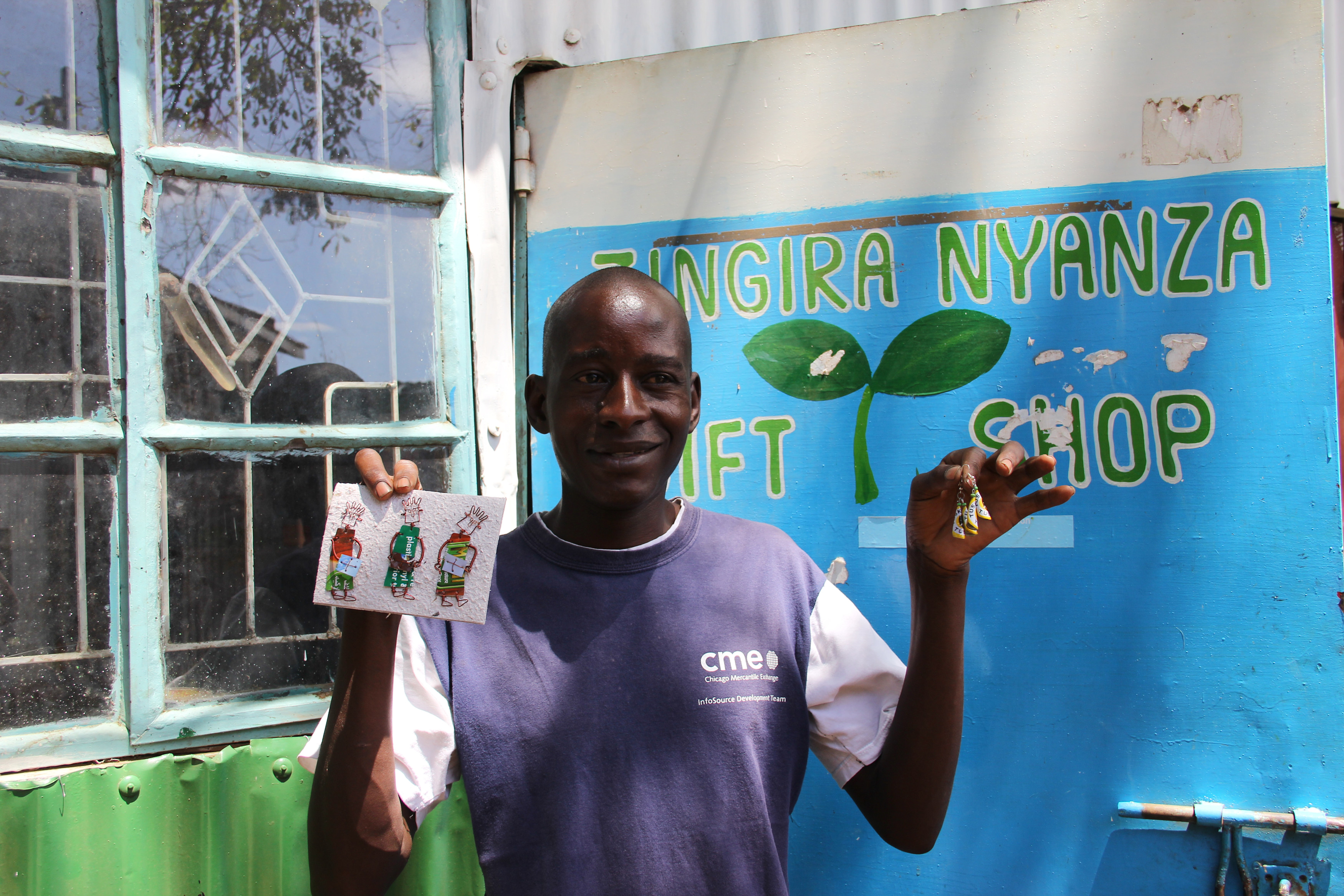 Kick trading, Kisumu Innovation Centre Kenya, was one of our favourite groups because the borrowers were enthusiastic and their workspace was bright. We entered to see some artisans painting, others selling items in the colourful stalls, as we ducked under hundred of mini wire bicycles and Santa Clauses in the outdoor workspace.
