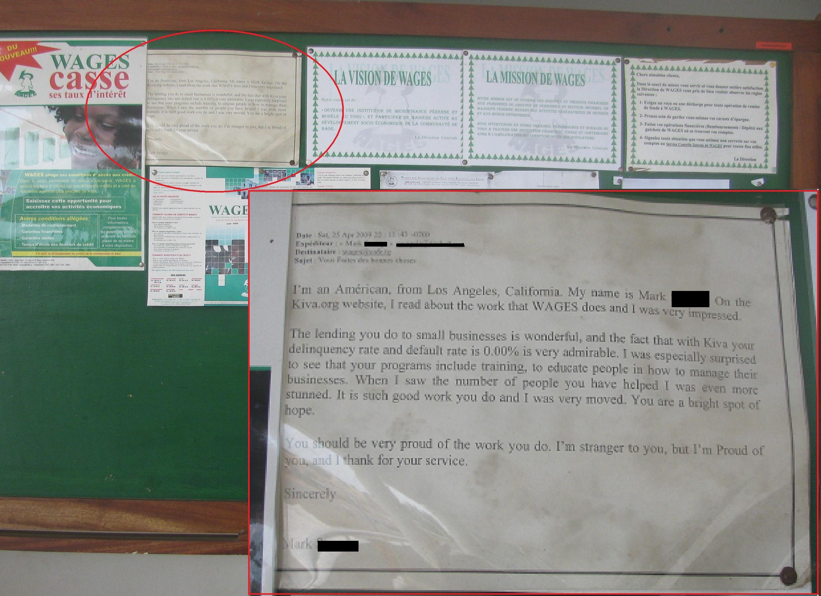 So it was so cool last week when I went to visit a WAGES field office in Lomé, Togo and saw this email from a Kiva lender named Mark, tacked to the agency’s official bulletin board for all its clients, staff, and stakeholders to see. In his message, Mark thanked WAGES for all the organization did to help borrowers in Togo and further praised WAGES for providing business training programs to its clients. “I’m a stranger to you,” he writes, ”but I’m proud of you and I thank you for your service.”