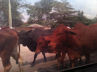 First, driving here sucks. There's no way around that; it's hot in the middle of the day, cars grind along on poorly maintained roads, people walk across freeways with a casualness that is alarming to the uninitiated. But we were delighted to see that people and cars weren't the only ones on the roads. Here's the view from my window as we approached Kitengela.