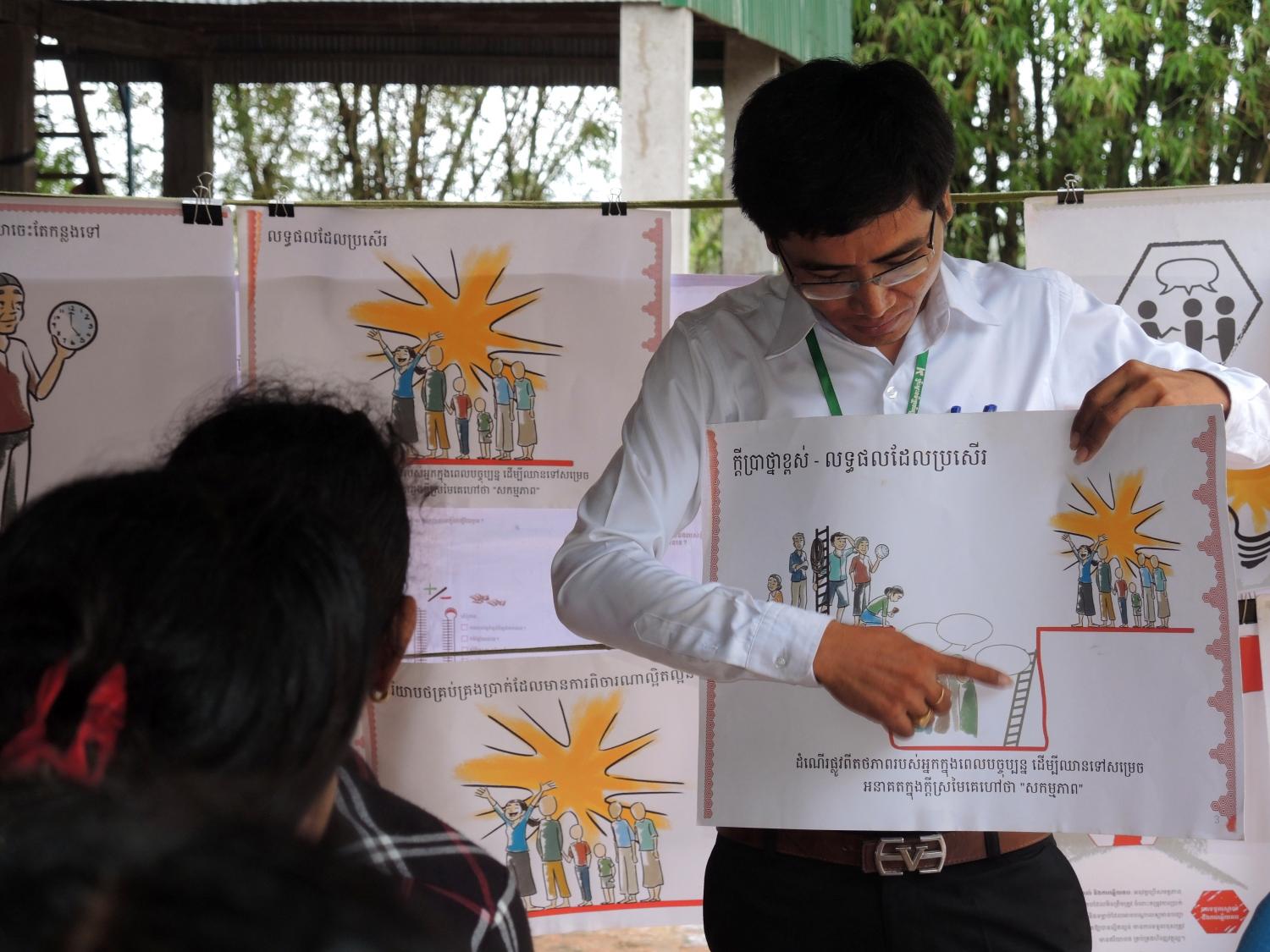 A KREDIT educator delivers a lesson in Financial Risk Mitigation to the Prey Poun Village VSU Community Bank, Kampong Trabek