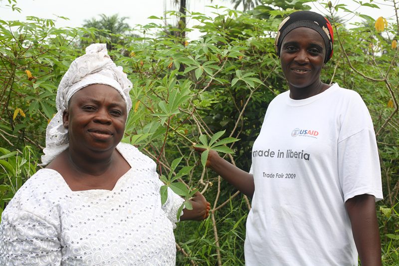 Jebbeh Passaway (L) and Satta Balo (R), clients of the Local Enterprise Assistance Program (LEAP), a Liberian microfinance institution, stand in a cassava field near Tiene, Cape Mount County on April 26, 2010.