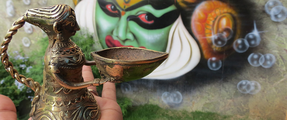 On my second week of Kiva Fellowship in India, I traveled to a small town called Gundalpet. Kiva partner organization Micrograam was assisting artisans find a market to sell their product through an arts & crafts exhibition. This picture is of a hand made earthen-oil-lamp holder made out of brass by an artist, promoted by MandiKraft (Micrograam's micro-venture partner). The background is a wall-mural by a local artist which shows a Kathakali dancer in the iconic make-up.