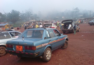 At least I did – until the appearance of a petit Cameroonian woman in a rather nice gold dress. Bugger. I knew six weren’t going to fit in the back, so I moved up, resigned to an hour in the gear stick position. But some chap directed that I should get out – Mama (as older Cameroonian woman are respectfully called) was to sit there. I made sure I shared a good section of my seat. Rather a squash.