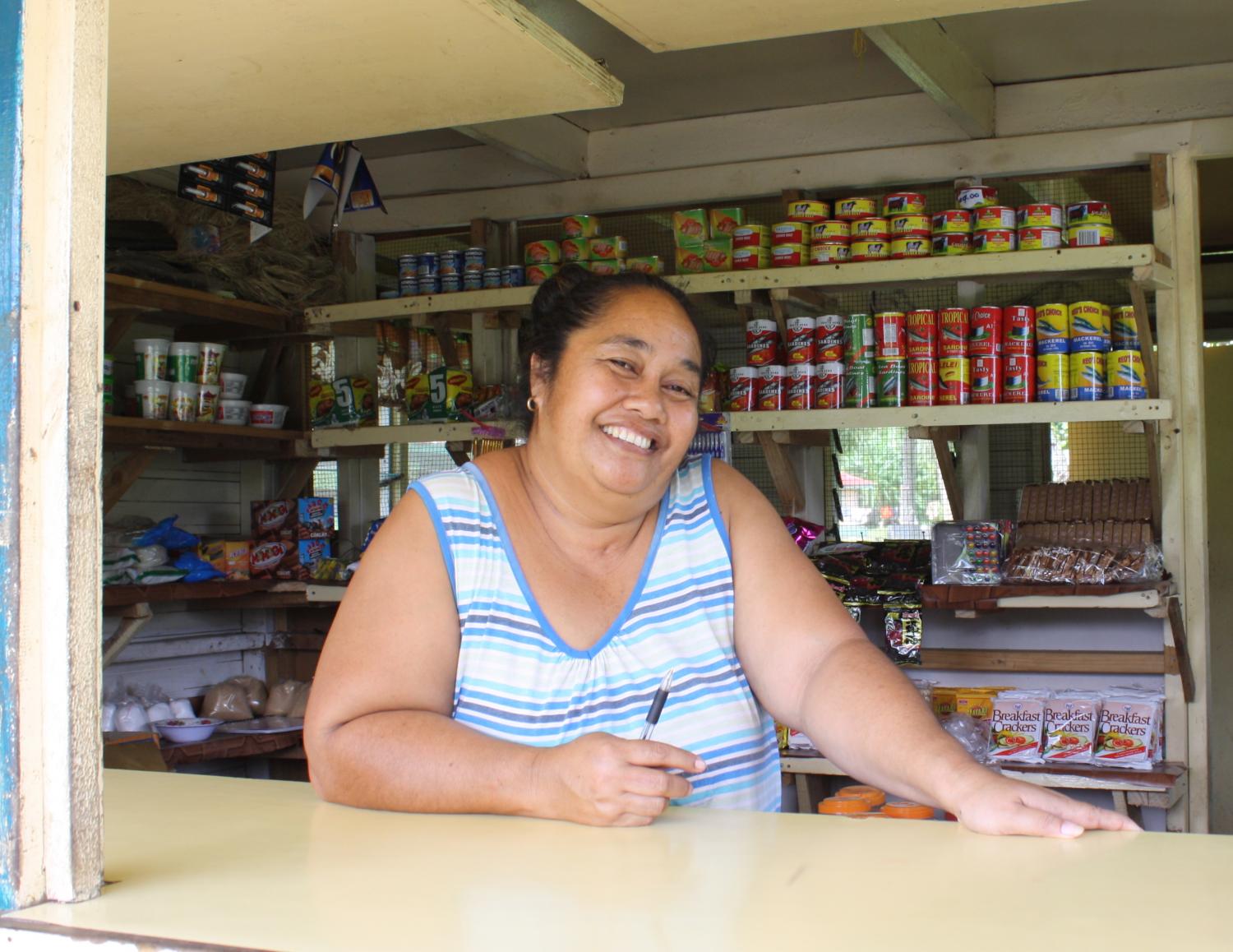 With her first loan of about US$250, Mile started a little taro and banana chip business. In 2013, after numerous loan cycles and lots of hard work baking chips and “keke-puaa” (steamed pork buns), Mile graduated from micro-loans and became eligible for a small-business loan of US$4,200. With this loan she was able open her own store, the one I meet her in today.