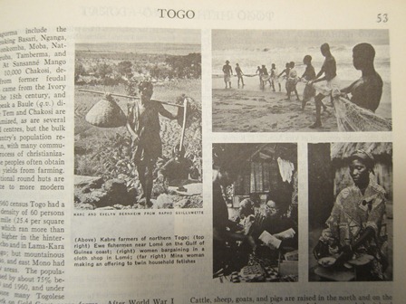 Is Togo much different from what the 1969 edition of the Encyclopaedia Britannica has to say? Agriculture still dominates the economy, people still haul in the fishing nets by hand on the beach in the morning, pagnes are still sold in the markets, and animism is still practiced–though this not as much as before. Pictures don’t define a nation, so read on.