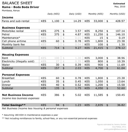 Before I left Mombasa, I asked Rama if I could take him to lunch, and ask him a few questions about his business. Over fries and cola, Rama and a fellow boda boda driver told me—in quite a bit of detail—about the financials of their work and lives. I’ve summarized most of what I learned in a balance sheet below, but if you’re interested in the specifics, please read on.