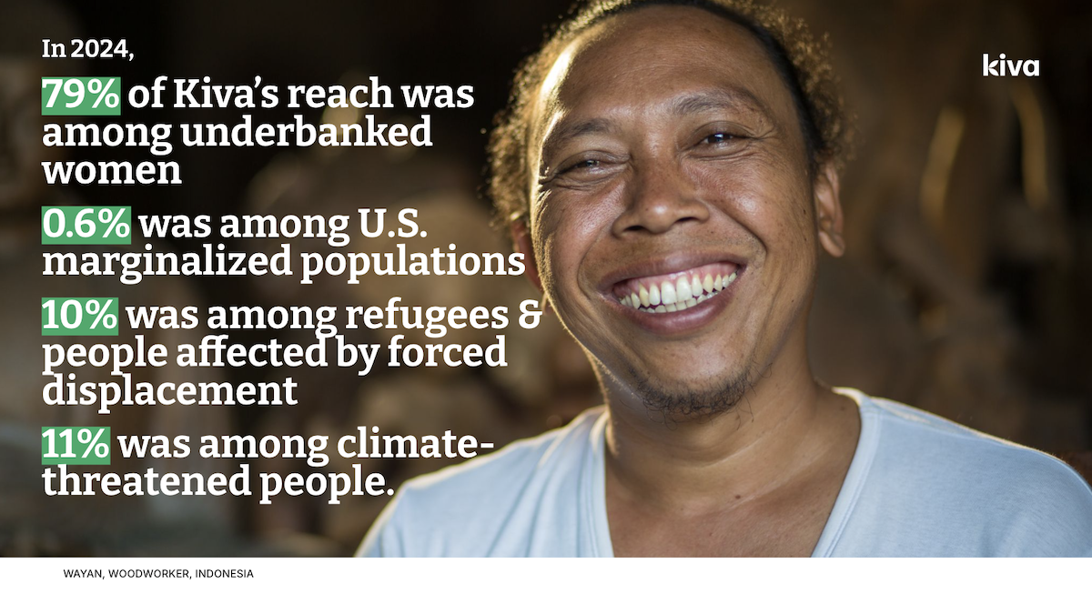 As I look back on 2024, I’m inspired by the strength and determination of Kiva’s global community. Together, we’ve made real progress toward our goal of financial access for all. This year, we reached millions of individuals and communities, opening doors to new opportunities and tackling some of the world’s biggest challenges.