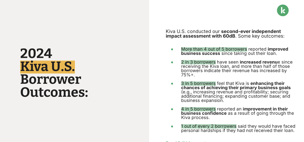Finally, our work to expand financial access for marginalized U.S. entrepreneurs continued to grow in 2024, supporting over 600 small businesses across the country with credit-building loans. Of all U.S. businesses reached, 77% were owned by BIPOC entrepreneurs. We also onboarded five new Kiva U.S. hub partners, expanding our reach into new communities, and translated the U.S. loan application into 30+ languages.