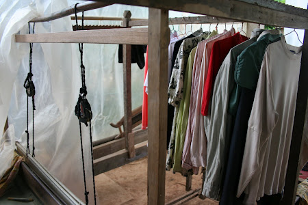 During my fellowship I met with many weavers, and saw even more abandon their trade in favor of working in garment factories. There are a couple of islands in the Mekong outside of Phnom Penh where most of the women living there are weavers. I visited the most famous of these islands, Koh Dach, and at house after house saw abandoned looms being used to hang laundry.
