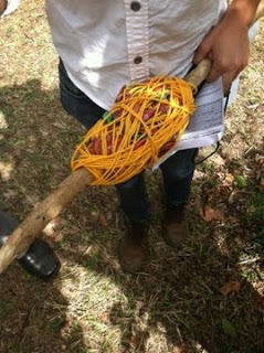 Tool that helps farmers properly space and plant seeds using bottle caps on a string to measure.