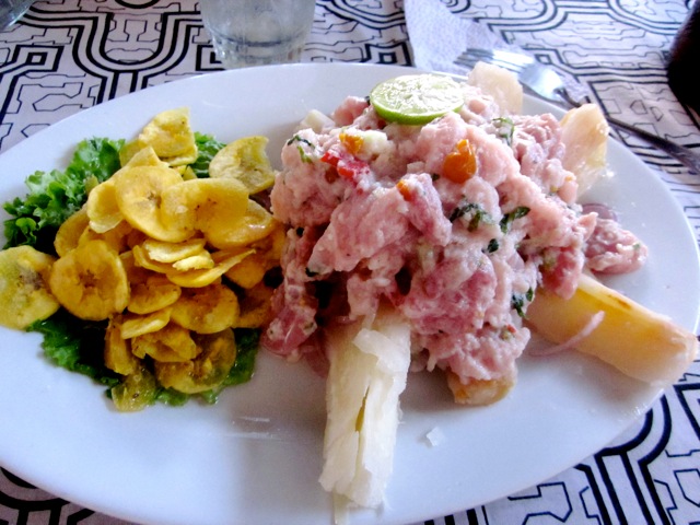 Kiva Fellow Carrie Nguyen, Peru, delivers on delicious: ceviche made of jungle fish, marinated in lime juice and sliced onions, served with yucca and chifles (banana chips). Cost, around ten soles, or USD $3.50
