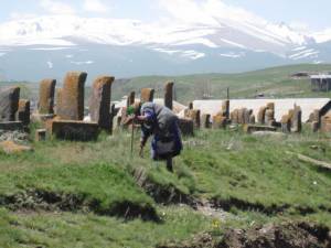 A few days ago I visited the Noratus region of Armenia where the highest concentration of Khachkars (stone-crosses) can be found. Upon arrival I noticed an elderly lady quickly climbing up a small hill. My first reaction was, what is she doing and why? I was rather surprised to see her climb this rather steep small hill at her age and her determination seemed unwavering. I few minutes later it became clear. She was trying to reach a group of tourists to sell hand knitted goods.