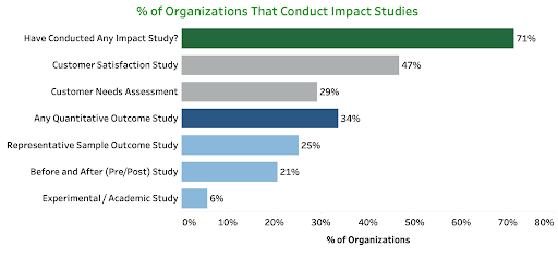The majority of these organizations (over 70%) are conducting impact studies, which is a promising sign of the growing awareness of the importance of measuring impact. However, as we look closer at the types of studies being conducted, we see that the percentage of organizations conducting customer needs assessments or formal quantitative outcome surveys is lower. This limits organizations’ ability to respond to issues affecting customers, understand their needs, or provide clear evidence that they are creating change for customers.