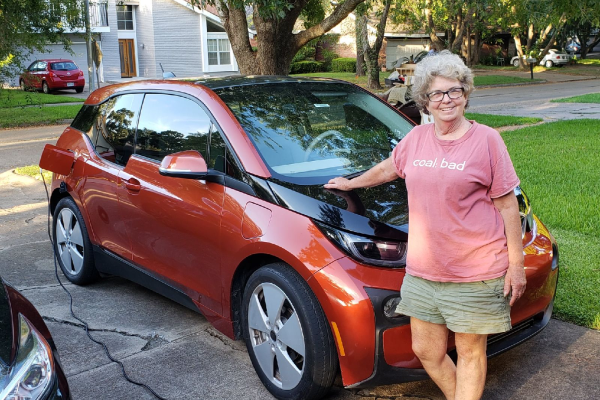Eleanor stands with her EV vehicle. I love my electric car. Fueling it costs less than $1 to drive 25 miles. Over the life of the car, the fuel saving will surpass the premium I paid for the car.