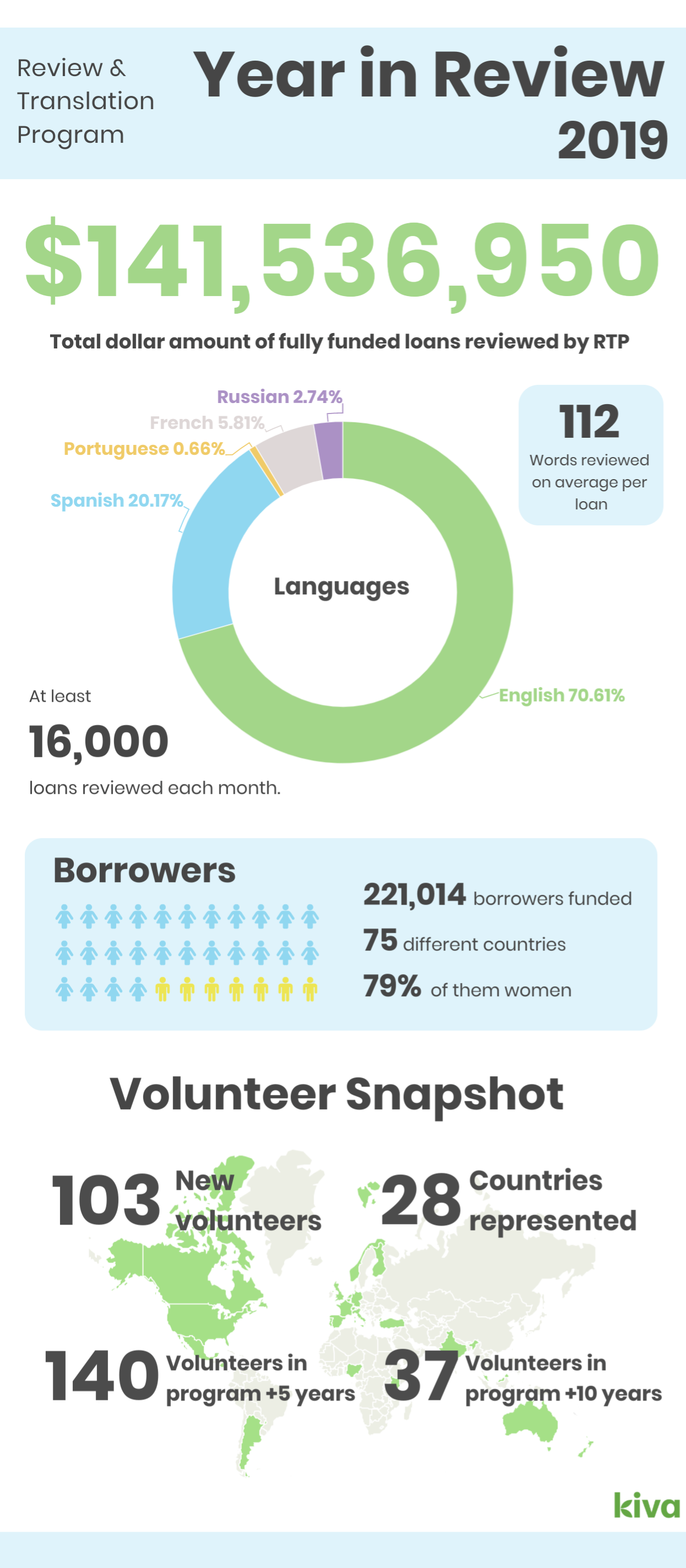 In 2019, Kiva branched out in a big way. From Labs to Kiva Capital, we have ever more reasons to depend on our editing and translating volunteers for the loan review process. This community of over 430 Review and Translation Program (RTP) volunteers regularly review 16k loan profiles each month (the current record is 21,221 profiles c. December 2018!) before they go live to Kiva.org -- thus bolstering Kiva’s due diligence process.